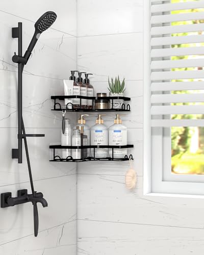 Sakugi - Corner Shower Caddy - 2 Pack, Adhesive Shower Organizers, Rustproof Stainless Steel Shower Shelves with 8 Hooks, No Drilling Bathroom Organizers and Storage Racks, Space-Saving, Black