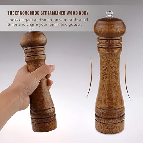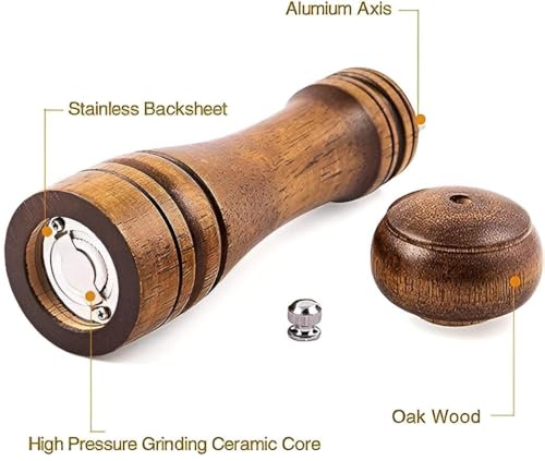 - PREMIUM MATERIALS: natural oak wood salt & pepper mill set with plastic ingredients free ceramic spinner. Non-abrasive materials ensure safe and long-lasting use, adding a touch of elegance to your kitchen.