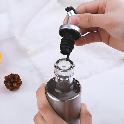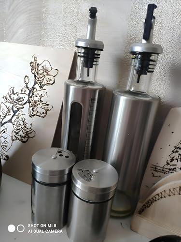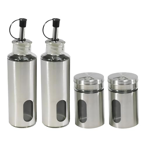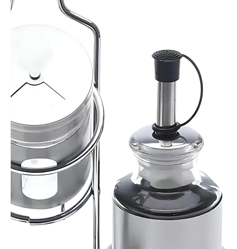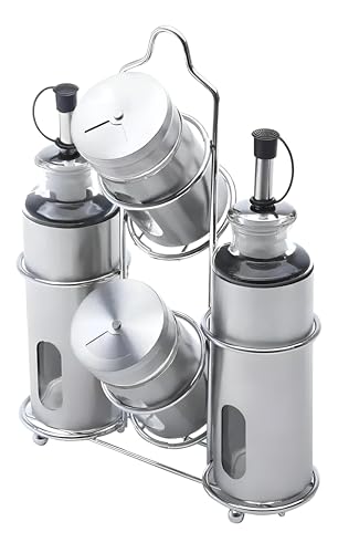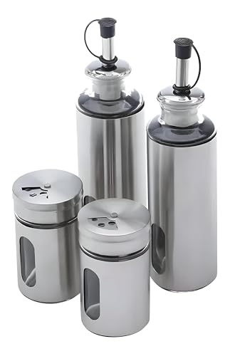 - This condiment set combines both style and practicality by featuring sleek stainless steel and glass containers, making it suitable for modern and traditional kitchens alike, while offering precision pouring and easy monitoring of contents.