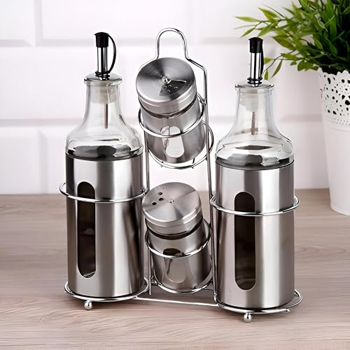 Generic - Salt and Pepper Shakers - Durable Stainless Steel Set with Oil and Vinegar Dispenser, 5-Piece Kitchen Condiment Organizer with Chrome Stand