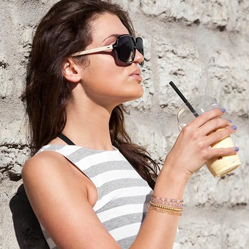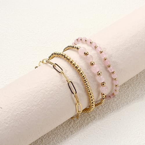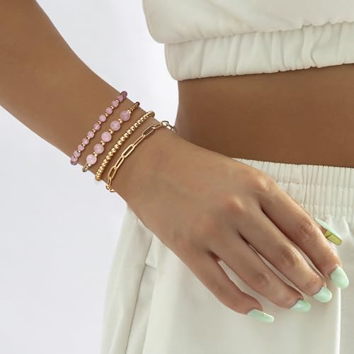 Sanfenly - Sanfenly Gold Beaded Bracelets For Women, 14k Real Gold Plated Bead Stretch Stackable Stacked Stacking Stretchy Layered Trendy Simple Pearl Turquoise Amethyst Crystal Paperclip Chain Bracelet Sets
