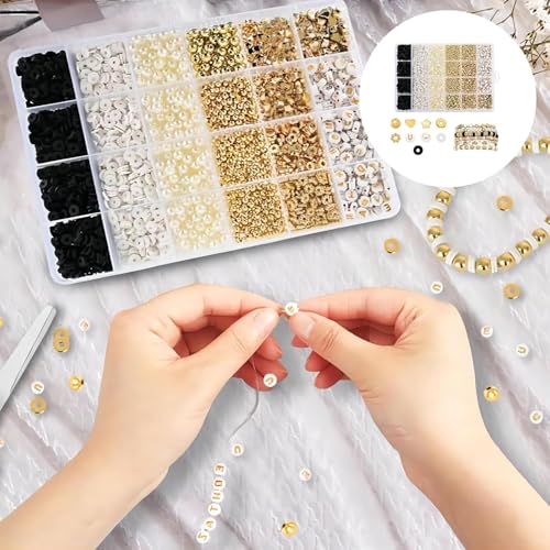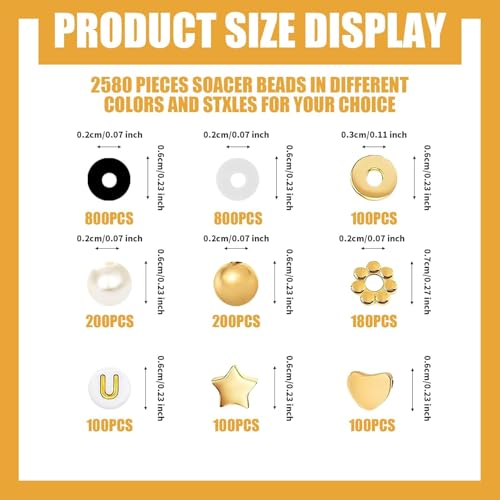 - 2580 قطعة، مجموعة متنوعة: تتضمن 2580 خرزة طينية باللون الأسود والأبيض والذهبي، جنبًا إلى جنب مع خرز الحروف الأبجدية وخرز القلب الذهبي، وأكثر من ذلك لإمكانيات إبداعية لا حصر لها.