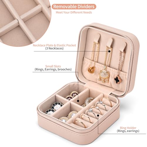 - 💖Jewellery Box - Multifunctional: This small jewellery storage box can hold rings, necklaces, earrings, stud earrings and other small jewellery. There are 3 necklace hooks with an elastic pocket that holds your necklace or bracelet perfectly in place, 4 compartments and 7 slots for earrings and rings. And it has two removable dividers to meet different requirements.