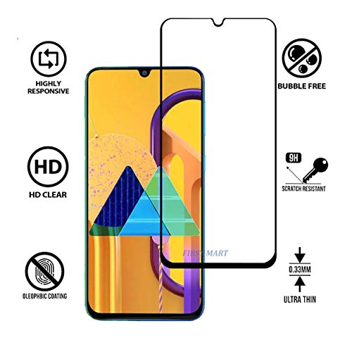 FIRST MART - واقي شاشة لموبايل سامسونج جالاكسي M30s / M30 / M31 / M21 / A30 / A30 / A30s / A50 / A50s، واقي شاشة لاصق بالكامل من الحافة إلى الحافة من نايس ستور، لون أسود