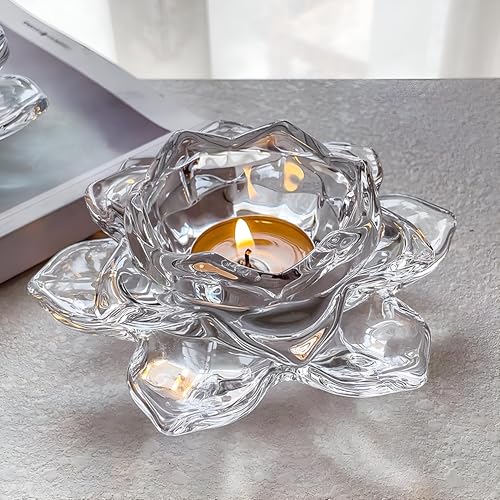 - The exquisite glass lotus flower tea light candle holder is a stunning addition to any home decor, perfect for festive occasions like Diwali, Christmas, or Eid. Its elegant design features three layers of lotus petals, making it not only a functional candle holder but also a beautiful decorative piece that enhances the ambiance of any room. The diameter of the holder is 80mm, providing ample space for tealights, which create a soft and romantic glow when lit. This candle holder is a versatile ch