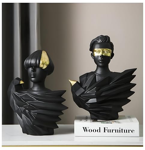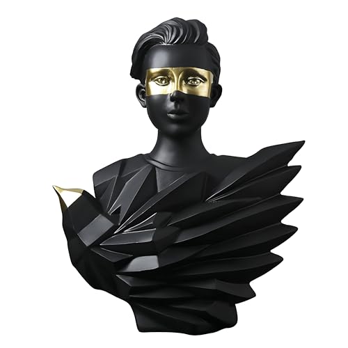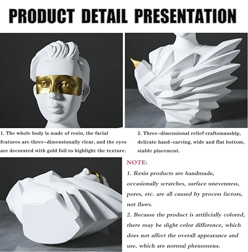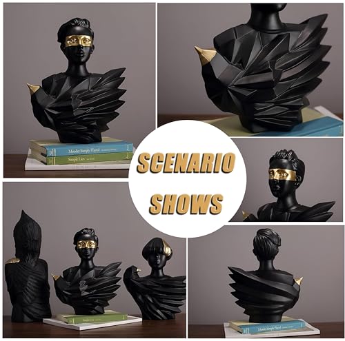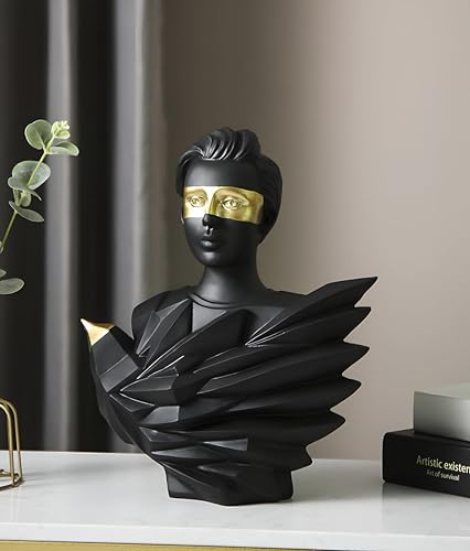 - This modern art sculpture serves as an eye-catching decorative piece, crafted from high-quality resin. Its detailed, three-dimensional facial features are accentuated with luxurious gold foil on the eyes, making it an exquisite addition to any desk, bookshelf, or living area that seeks a touch of elegance and sophistication. Its striking combination of black, gold, and white adds a modern flair, effortlessly enhancing the aesthetic of your home, office, or any space where it is displayed.