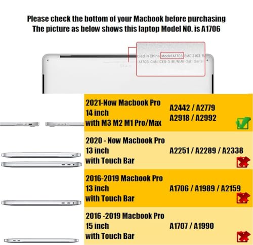 - مناسب فقط لجهاز ماك بوك برو 14 انش موديل A2918 A2992 A2779 A2442 مع رقاقة M3 M2 M1 برو/ماكس (إصدار 2021-2023) ولوحة مفاتيح بتصميم الاتحاد الأوروبي. يرجى التحقق مرة أخرى من رقم طراز ماك بوك الخاص بك "A1xxx" في الجزء السفلي من اللاب توب لتحديد التوافق.