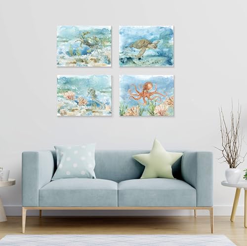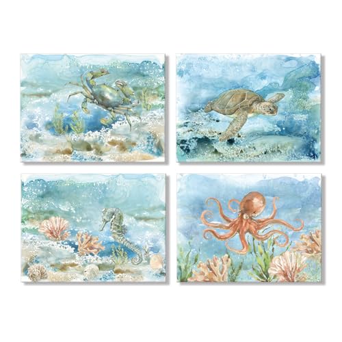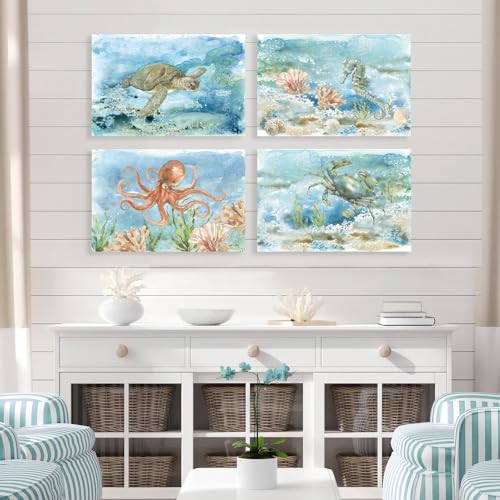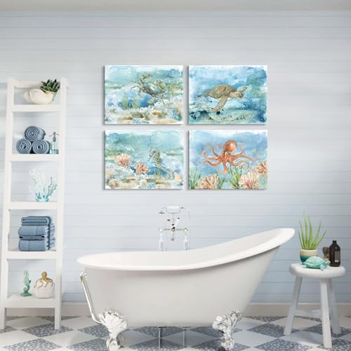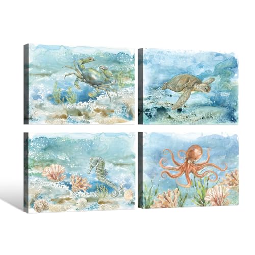 JAPO ART - Sea Turtle Bathroom Wall Art Ocean Decor Watercolor Octopus Crab Seahorse Canvas Prints Coastal Sea Life Animal Painting for Home Wall 16x12Inchx4pcs