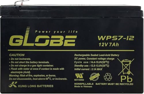 - Rechargeable battery 12V 7A hour. Dimensions 151x65x94mm. Brand: GLOBE Usage: Uninterruptable Power Supply (UPS) Electric Power System (EPS) Emergency backup power supply Emergency light Railway signal Aircraft signal Alarm and security system Electronic apparatus and equipment Communication power supply