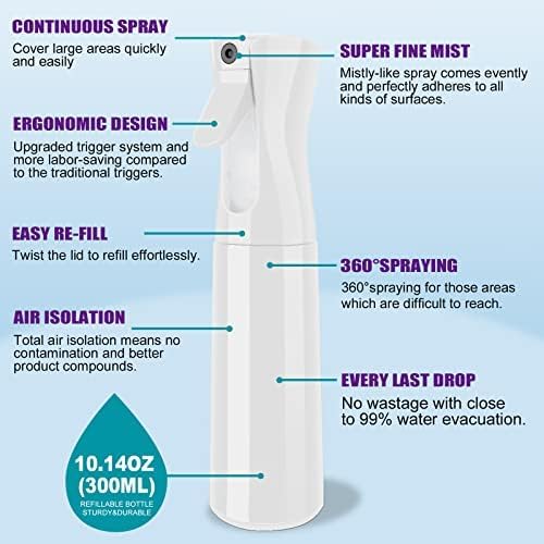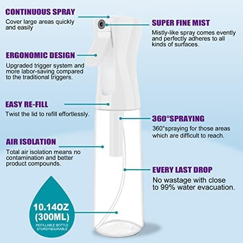 - 【360 Degree Hair Spray Bottle】Continuous spray bottle can spray 360 degrees to hard-to-reach areas. You can even use it sideways and upside down without leaking or losing primer, so all areas are reached so you can utilize even the last drop