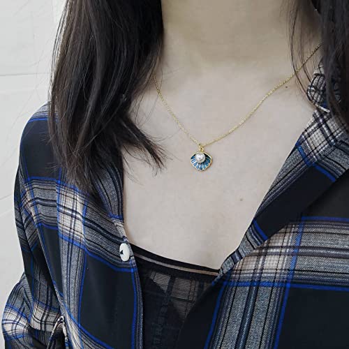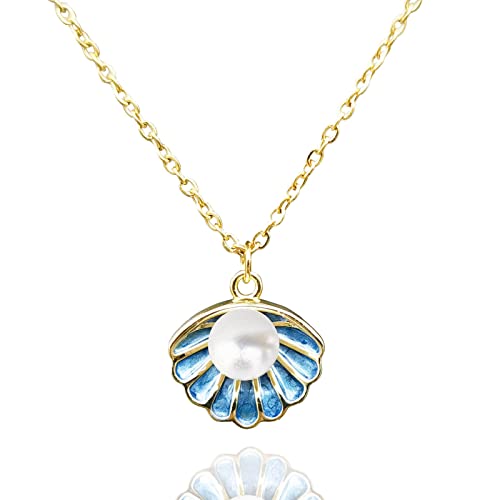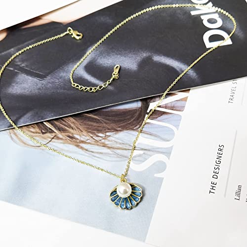 Generic - عقد بقلادة على شكل صدف البحر قلادة زرقاء من المينا للنساء مجموعة خرز اللؤلؤ الابيض في شاطئ البطلينوس البوهيمي صغيرة لطيفة مطلية بالذهب للبنات المراهقات