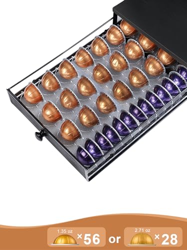 - Large-Capacity Coffee Capsule Storage Rack:This nespresso vertuo pod holder measures 11.4" x 14.9" x 3.3" and fits every Nespresso capsule type—no matter which machine you use. It easily stores up to 28 large capsules or 56 small ones, so coffee lovers can mix and match their favorites without clutter. Perfect for keeping your counter organized and your brew ready to go.