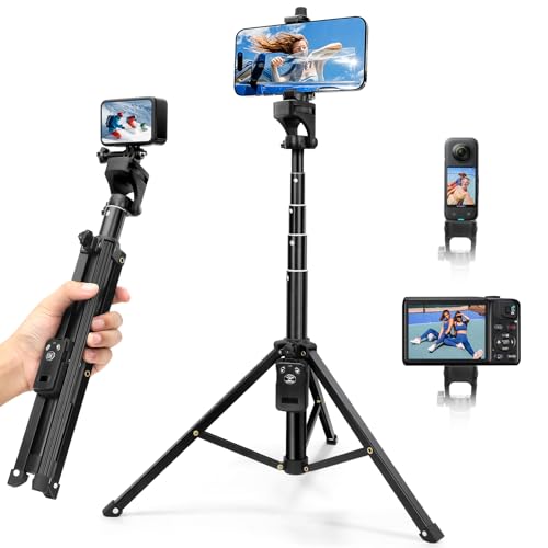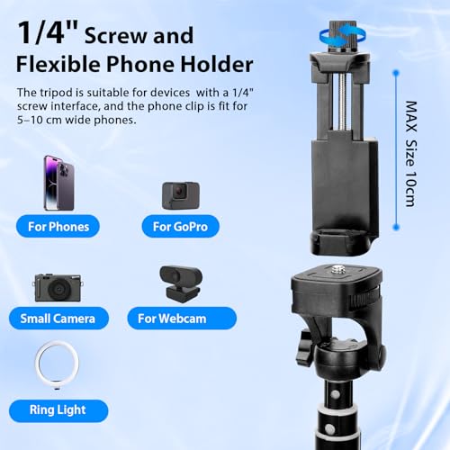 - 【Versatile Tripod & Flexible Expandability 】The universal phone holder is compatible with all cellphones between 5-10cm. Mounted on the top of the tripod stand with universal 1/4" screws that can be connected to most small cameras, GoPro, and even ring lights. Let this mobile tripod go with you from home or office to outdoors, from novice to professional. It’s perfect for selfies, group photos, adventure travel, vlogging, YouTube, TikTok videos, FaceTime, and Instagram.