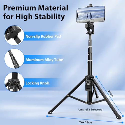 - 【Stable Phone Tripod Stand】Phone stand tripod base is made of aluminum legs with anti-slip rubber and a reinforced umbrella structure design for ensuring stability, durability, and security for each shot, which can enable the iPhone tripod to be used for a long time. It also has more rigidity and flexibility. The fast lock knob helps lock the tripod in seconds.