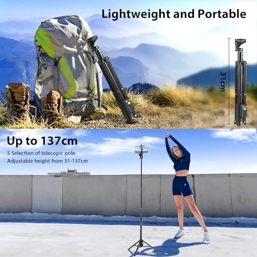 - 【Extendable & Aluminum Tripod Stand 】Ufanore makes no compromises when it comes to quality. A precision-crafted aluminum extension rod extends smoothly and uniformly, reaching up to 137cm with 5 sections of telescopic poles. Only weighing 432g and able to be folded to 31cm, the tripod is lightweight and portable, making it easy to travel.