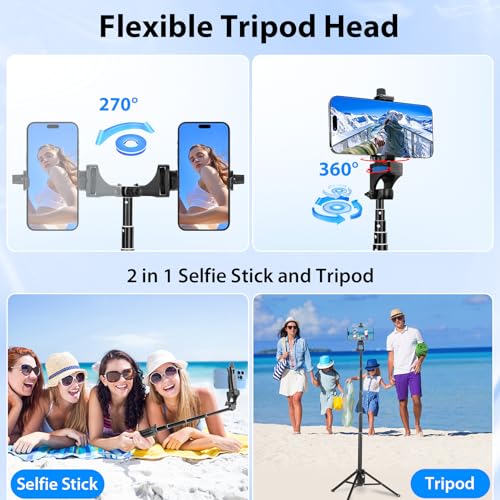 - 【Easy framing & Professional Tripod 】 2 in 1 Multifunctional portable tripod can be used as both a selfie stick for iPhone. A versatile iPhone stand tripod with a flexible tripod head supports extremely easy adjustment of horizontal and vertical positions. It lets you gain unique vantage points and angles when filming, giving you a wider angle and a more diversified composition.
