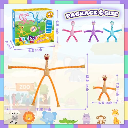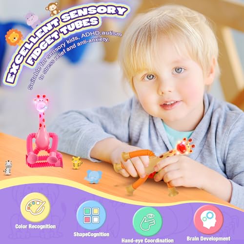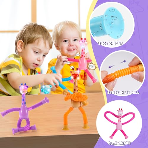 - 🦒 【Giraffe Fidget Toys for Kids】: This pop tubes for toddlers have 4 different color giraffes with suction cup on the bottom, which can be retracted and deformed freely with pop sound. This sound will attract your little one's attention and drive away boredom!