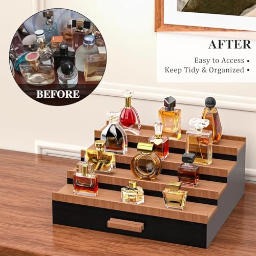 - 4-Tier Stepped Design for an Organized Display:This cologne organizer for men boasts a unique 4-tier stepped design that provides ample display space for your fragrance collection. Each tier securely holds bottles of various sizes, ensuring your collection is neat, organized, and visually appealing. Whether in the bedroom, bathroom, or closet, this cologne stand adds a touch of elegance and sophistication to your space