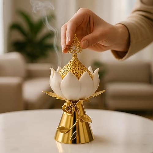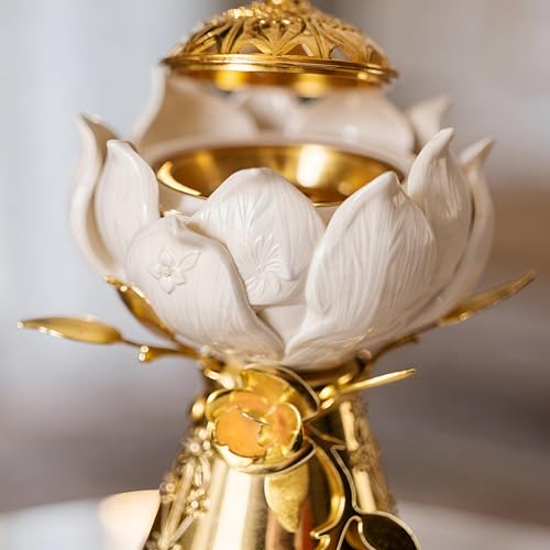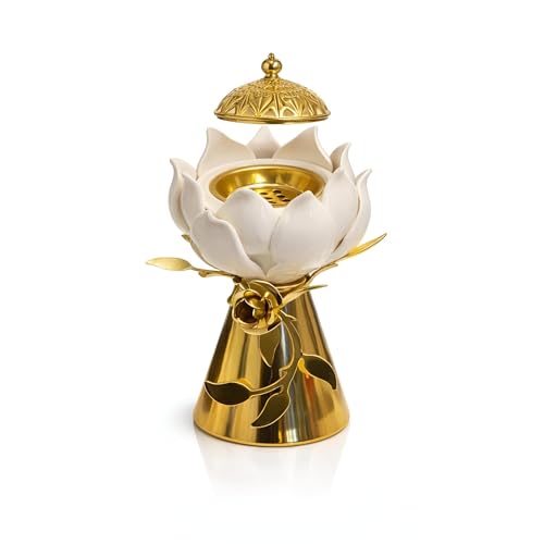 - Elegant lotus design: white ceramic petals open to reveal a golden brass interior, merging spiritual symbolism with modern luxury.
