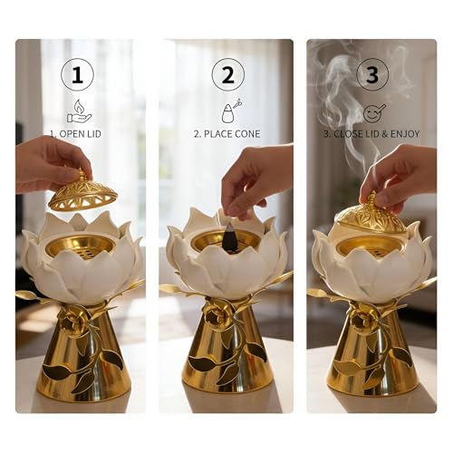 - Complete functional set: includes lotus flower holder, brass stem with leaf detailing, and removable ornamental lid for easy cleaning and smoke control.