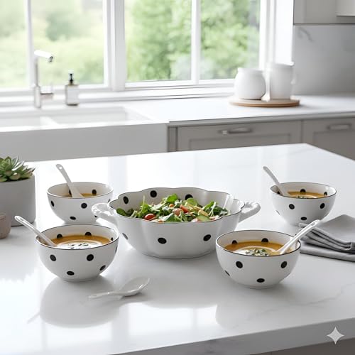Generic - Serving Bowl Set - Beautiful porcelain dishes designed for precise portioning and elegant table decoration. The set includes 5 pieces: 4 bowls, 1 large bowl, and 4 spoons.