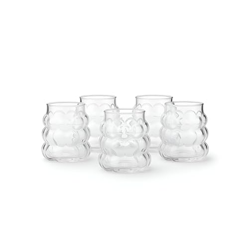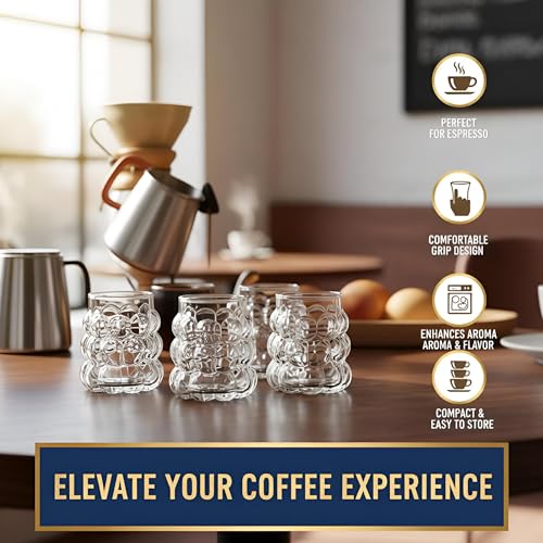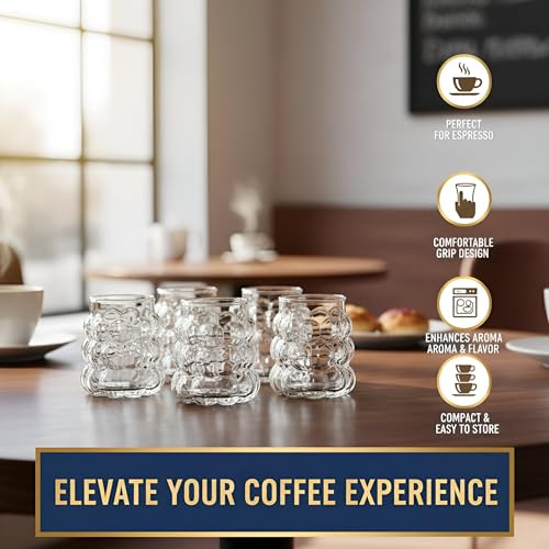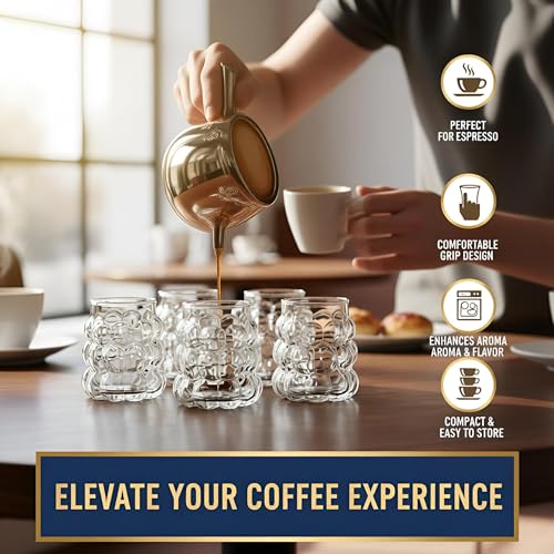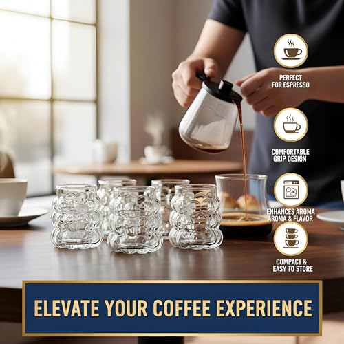 - This set features exquisitely designed clear glass cups with a textured bubble pattern that enhances visual appeal and provides an ergonomic grip, making your tea drinking experience both elegant and comfortable. The small size is perfect for serving traditional hot beverages like Turkish tea, while the transparent glass allows you to enjoy the rich colors of your drinks, adding to the overall aesthetic pleasure.