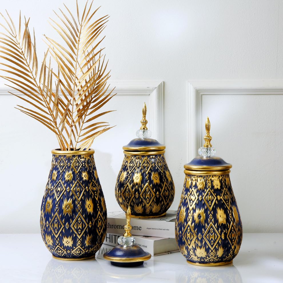 - ELEGANT DESIGN: Set of 3 stunning ceramic vases featuring royal blue and gold geometric patterns with ornate crystal-topped lids, perfect for adding luxury to any room