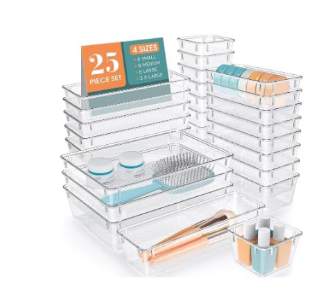 Generic - Set of 25 clear plastic drawer organizers, multi-size, organize drawers in bathroom, makeup, jewelry, kitchen and office (imported)