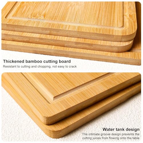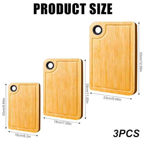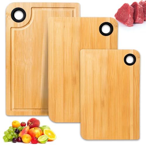 VEGOATY - Set of 3 Bamboo Chopping Boards, Kitchen Board Made of Bamboo Organic with Juice Groove and Hanging Holes, Chopping Board Set, Wooden Chopping Boards Can Be Used on Both Sides, BPA-Free for Fruit,