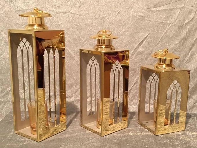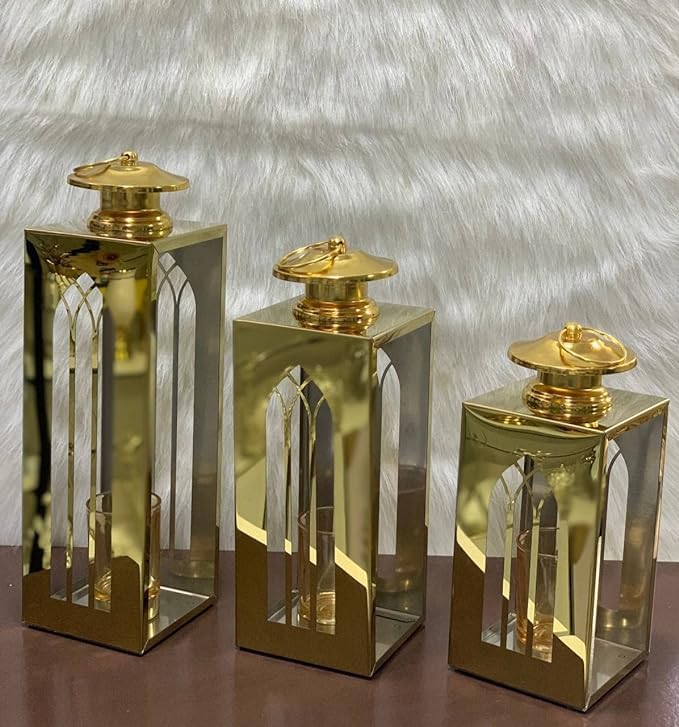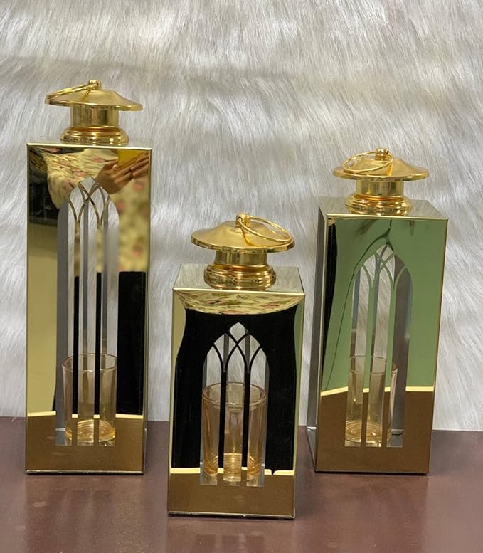 LC - Set of 3 Different Sizes Lanterns Perfect Gifts or Chic Home Decor in Ramadan Atmosphere (Gold)