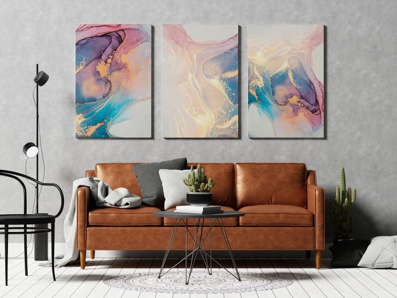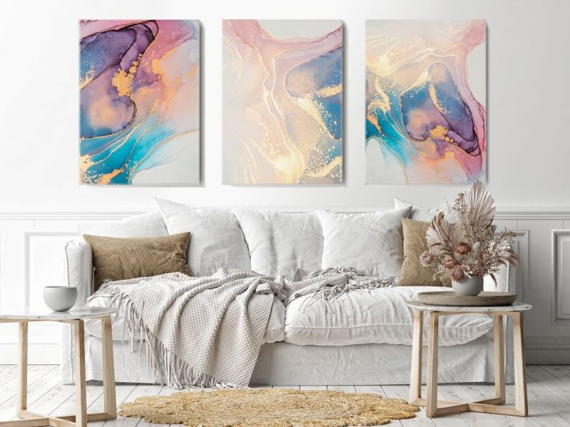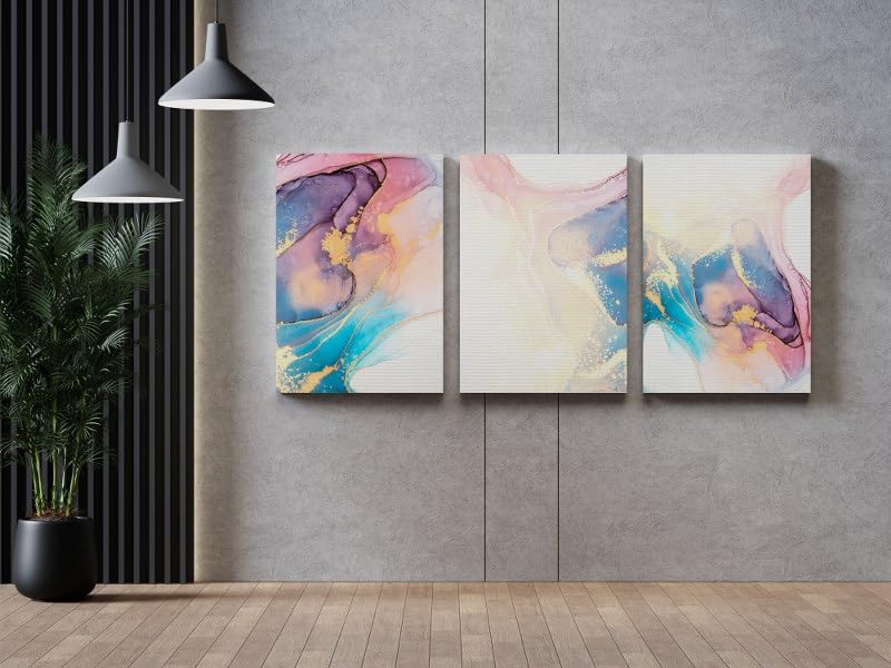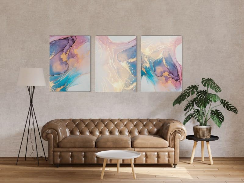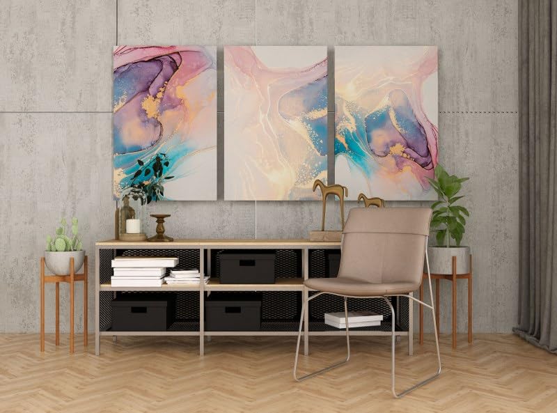 Home Gallery - لوحة فنية تجريدية على قماش بألوان وردي وأزرق وذهبي مع تصميم رخامي بمقاس 60×40 سم، مجموعة من 3 قطع