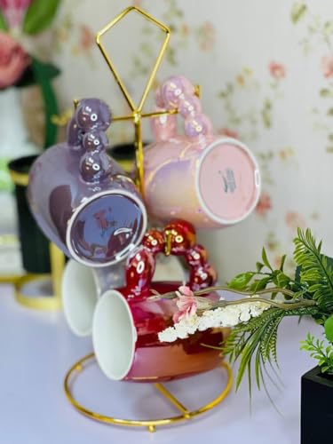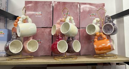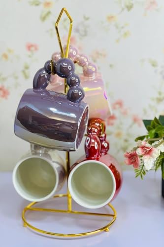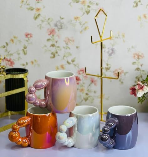 Generic - Set of 4 on Metal Stand, Ceramic Bubble Handle, Pearl Colored Milk Cups, Colorful Ceramic Coffee Cups, 400ml