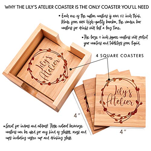 - PACKAGE CONTAINS: Our personalized wooden coaster comes as 5 pieces 4 laser engraved coasters with a size of 4"x4" and 0.3 in thickness each and a holder with felt pads on the back ( all 4 corners ) to keep them together, the coasters and the holder are made from premium quality of wooden Bamboo.