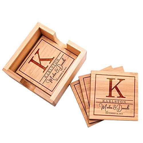 CustomizationMill - Set of 4, Personalized Wooden Coasters Coasters for Drinks, Custom Engraved Bamboo Coasters for Coffee Table w/Holder, Presents for New Home #D7