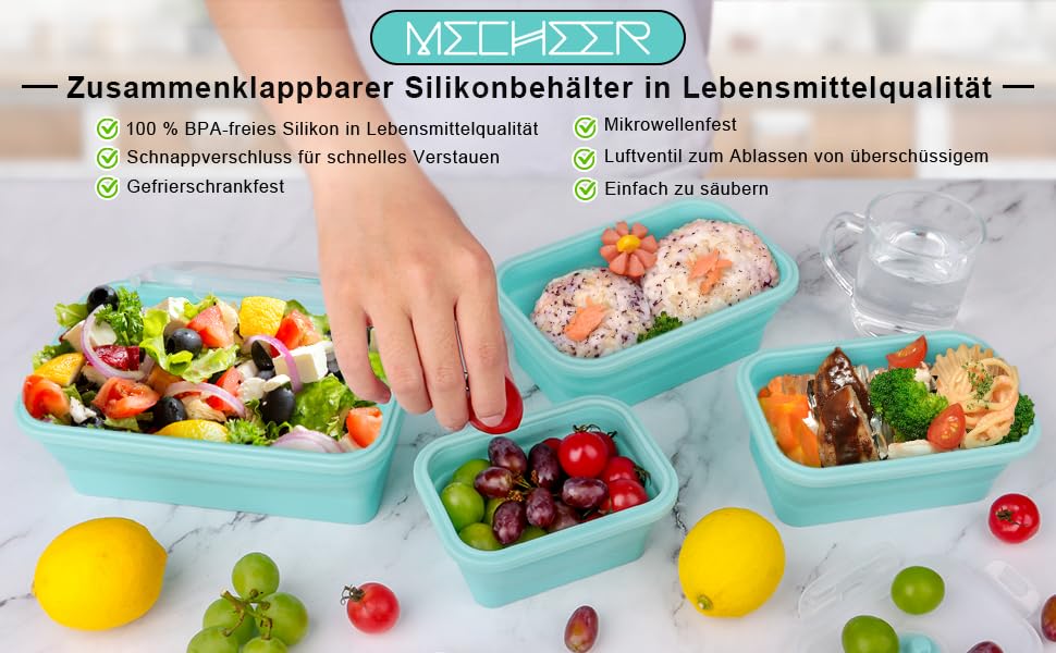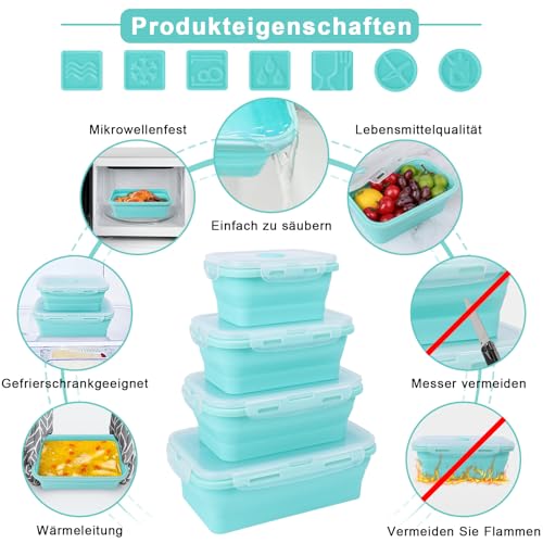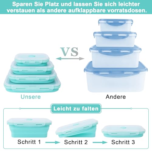 MECHEER - Set of 4 Silicone Food Storage Containers with Lid, Airtight, Foldable Lunch Box Storage Container Sets with Lid, Bento Box, Food Box, Foldable Bowl, Camping Accessories, Folding Bowl for