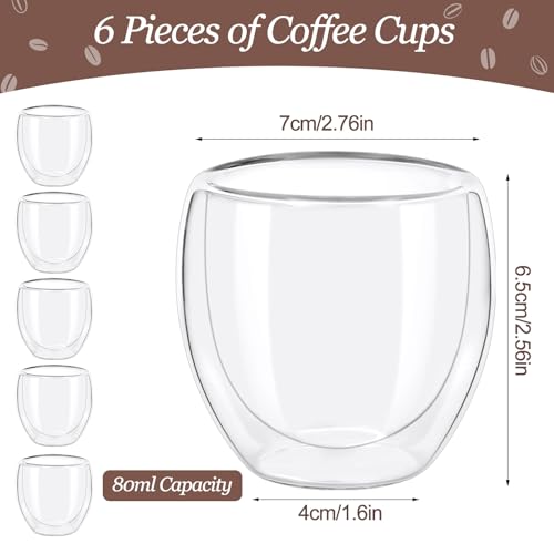 - MULTI USE This set includes 6 espresso shot glasses with a capacity of 80ml per glass, perfect for entertaining guests or enjoying drinks with the family. Ideal glasses for cappuccino, tea, latte, espresso or cold drinks.