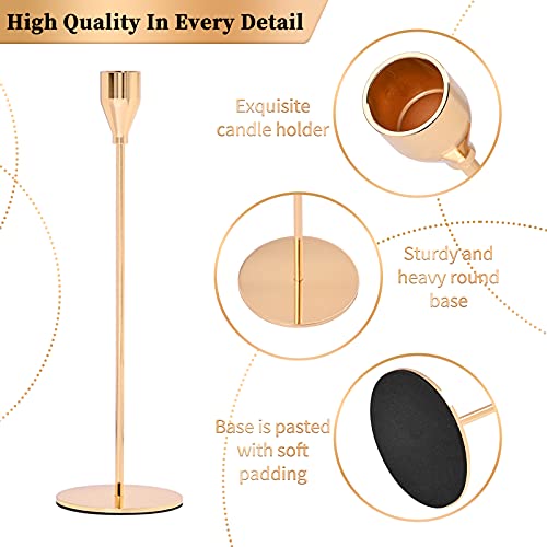 - ★★★ Quality Details: The stands for taper candles are made from high quality and easy-to-clean iron, taper candle holders surface is electroplated to elegant french gold for durability. Each candle holder has a sturdy and heavy round base,the large-diameter circular chassis ensures comfort and safety,the base is pasted with soft padding to protect your furniture. which absolutely not easy to shake, fall and slide.