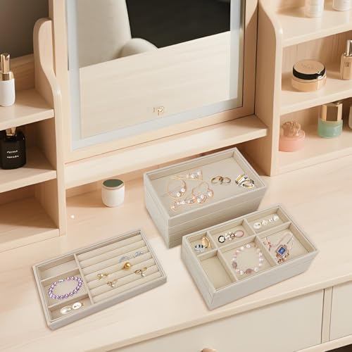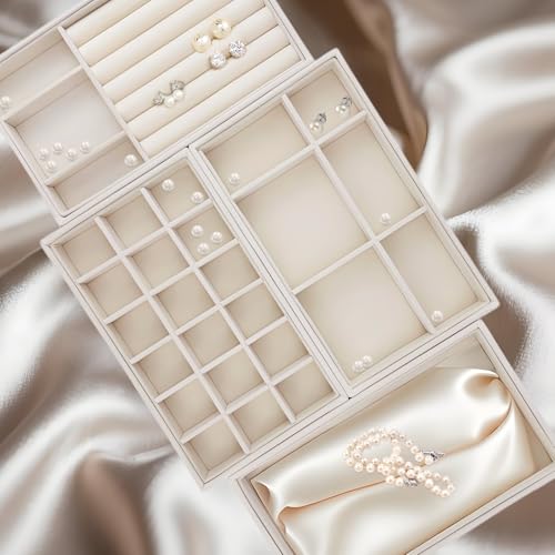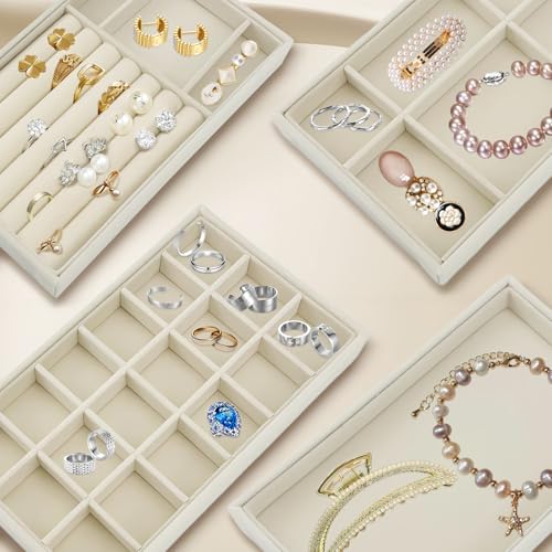 Seuqhck - 8 Pack Jewelry Organizer for Drawer, Necklace Velvet Storage Display Tray, Stackable Insert Divided Holder for Bracelet Rings Earring Brooch Watch, Beige 4 Styles