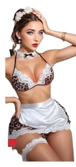 عام - Sexy French Maid Costume Set, Leopard Print Lingerie with White Lace Apron and Hair Accessories, 75-85 kg
