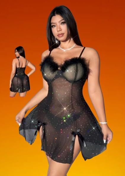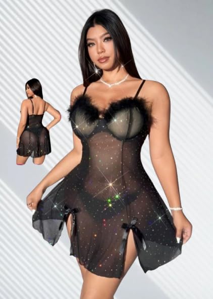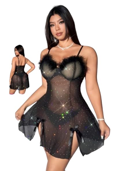 Generic - Sheer Mesh Babydoll Lingerie, Black with Sparkle Details, Feather Trim Cups, Spaghetti Straps