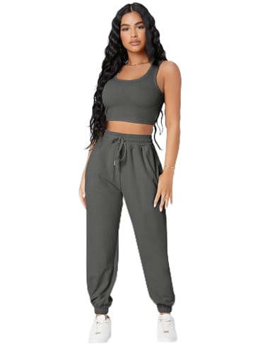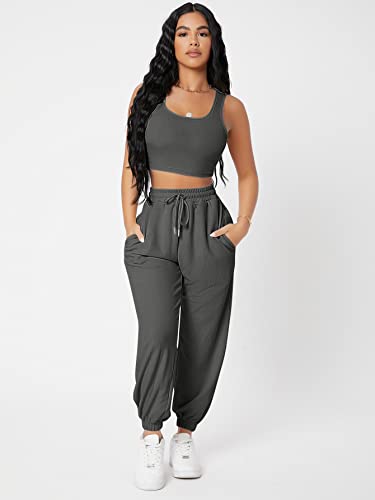 SHEIN - SheIn 2pc Women Clothing Set Women PETITE Solid Crop Tank Top And Joggers Set, M1754650, Dark Grey, Petite L