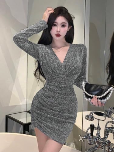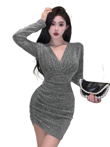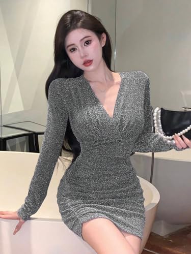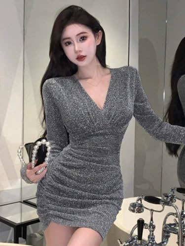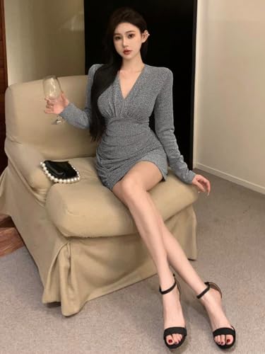 Generic - فستان كوكتيل قصير مكشكش برقبة على شكل حرف V وأكمام طويلة، فستان أنيق للحفلات الراقصة بلون رمادي للنساء لعيد الحب من شي ان