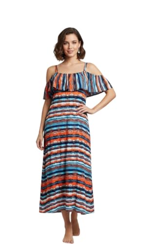 Generic - Shein Women's Cold Shoulder Maxi Dress, Blue and Orange Tie-Dye Print, Ruffle Overlay, Spaghetti Strap. Size XL