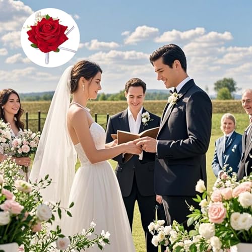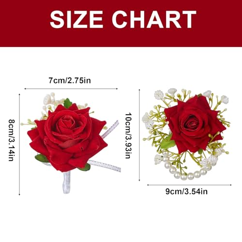 - 【Easy-to-Wear & Low-Maintenance Design】Each piece in this red corsage set is carefully packaged to maintain freshness. The wrist corsages for weddings feature a secure band for easy wear, while the boutonniere stays in place all night. If needed, simply adjust petals for a flawless look!