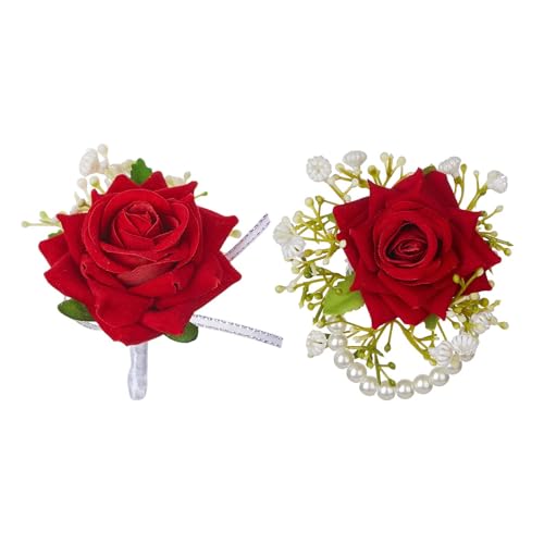 ShiningUU - Wrist Corsage & Boutonniere 2pcs Red Artificial Flower Wrist Corsage Bracelet & Buttonhole Flower Accessory for Prom Wedding Party Groom Bride Groomsmen Bridesmaids Prom Suit Decoration