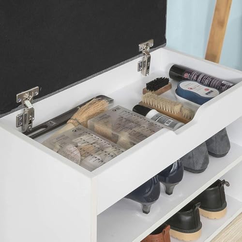- Are you also lacking the option to sit in the hallway to comfortably wear your shoes? Then we have the right solution for you! This shoe seat gives you enough storage for your shoes and a padded seat. The shelves provide enough space for your shoes and a spacious storage space under the seat allows you to store different items like shoe cleaning items. Non-skid rubber feet allow for a secure rack