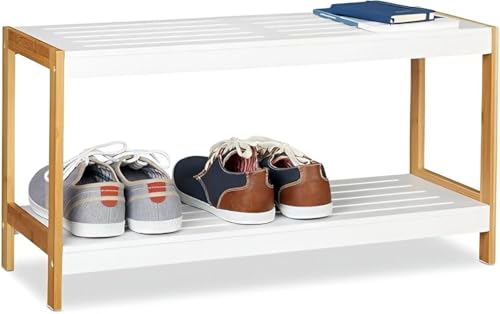 Generic - Shoe Organizer - Sturdy dual-level shelf in white and natural finish, built with bamboo and medium-density fiberboard for lasting durability.