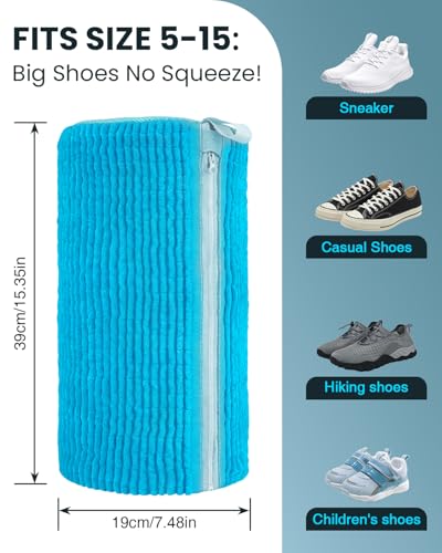 - 👟【Fits ALL Shoe Types (Up to Size 15)】Bigger than most shoe bags! Fits men’s sneakers, women’s flats, kids’ shoes, and more—with room to spare. Use one shoe laundry bag per pair for convenience, or clean each shoe separately for a thorough wash. Perfect for athletic shoes, casual wear, and even delicate fabrics!