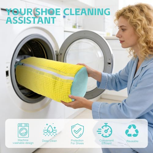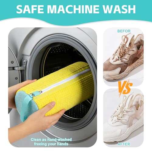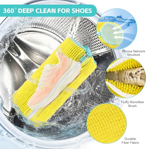 SendyFeather - شنطة غسيل الاحذية قابلة لاعادة الاستخدام مع فرش منفوشة مدمجة للتنظيف الشامل بزاوية 360 درجة، شنطة غسيل الاحذية مصممة للغسالة والمجفف (اصفر، قطعتان)