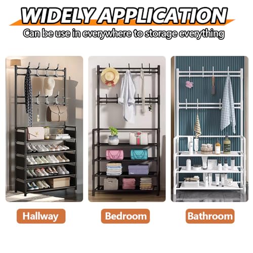 QEUUNEY - منظم أحذية مع أرفف تعليق للمعاطف من 5 طبقات، منظم أحذية بأرفف، رف معدني للقبعات والمعاطف مع 8 خطافات مزدوجة، منظم تخزين الأحذية لغرفة النوم والرواق والمكتب والسكن (77 سم × 35 سم × 1.68 متر، أسود)
